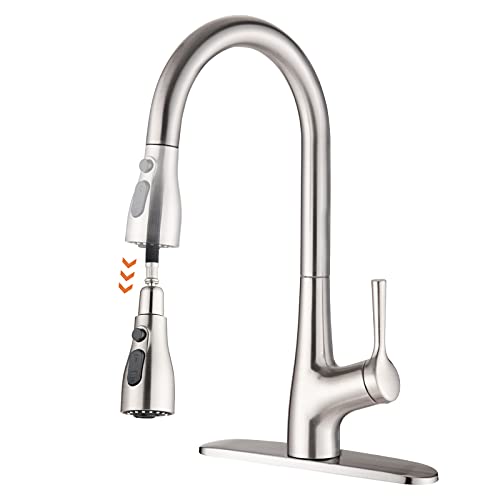Consumer Reviews Brushed Nickel Kitchen Faucet with Pull Down Sprayer, Single Handle Faucet for Kitchen Sink, High Arc Kitchen Faucets with Deck Plate, 3 Spray Modes Pull Out Kitchen Sink Faucet, 1 or 3 Hole Install